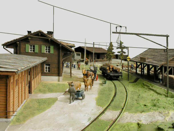 Neben der belebten Strasse befindet sich das Anschlussgleis der Sägerei. Ein Güterwagen mit Stammholz ist eingetroffen und wartet auf den Entlad.